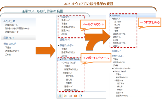 本ソフトウェアはこれらのフォルダを一つにまとめ、今まで使っていたメールのフォルダ構成を復元します。(下図右の状態)