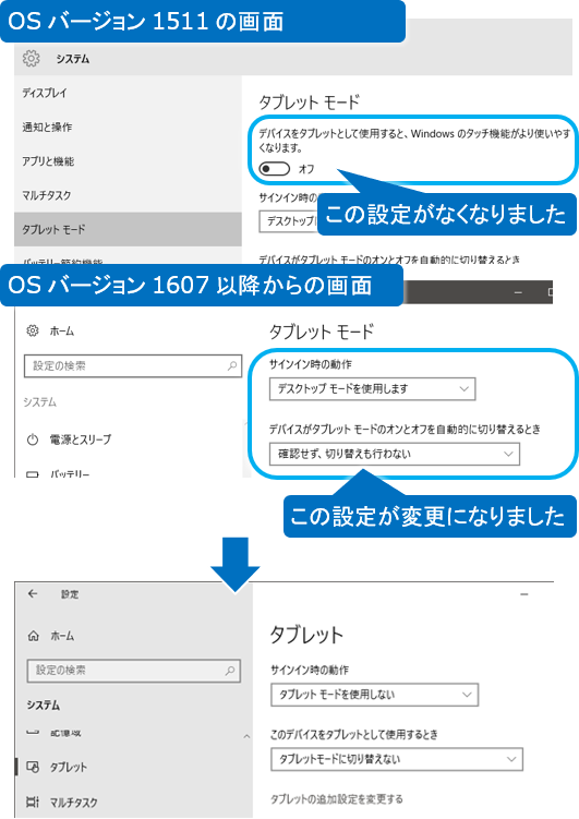 タブレットモードの設定画面が下記のように変更になったのが理由です。